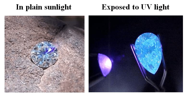 Some diamonds exhibit fluorescence which means that they fluoresce in blue color if they are subjected to a UV light source.